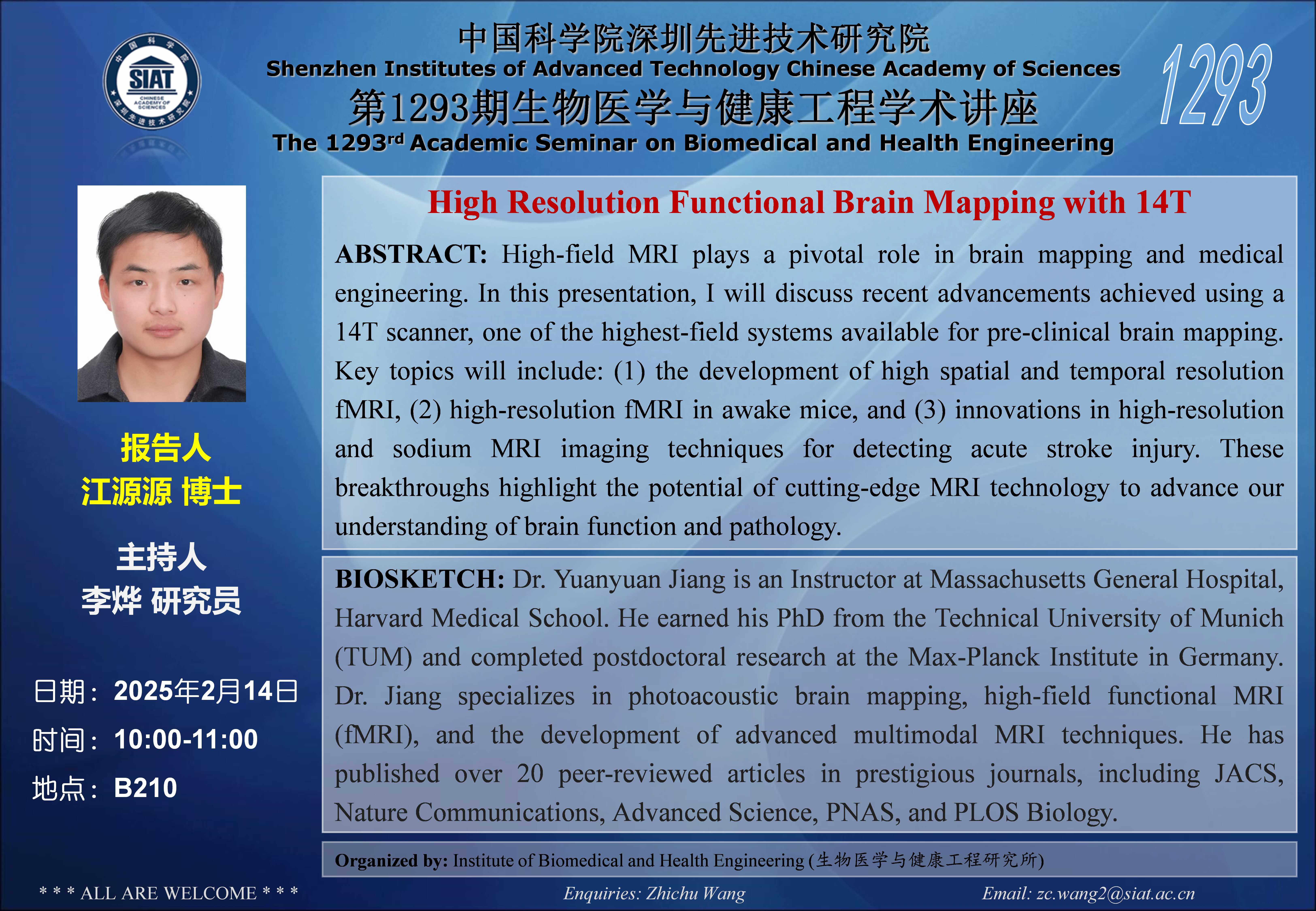 本次讲座邀请了哈佛医学院麻省总医院  江源源  博士带来题为High Resolution Functional Brain Mapping with 14T的报告。