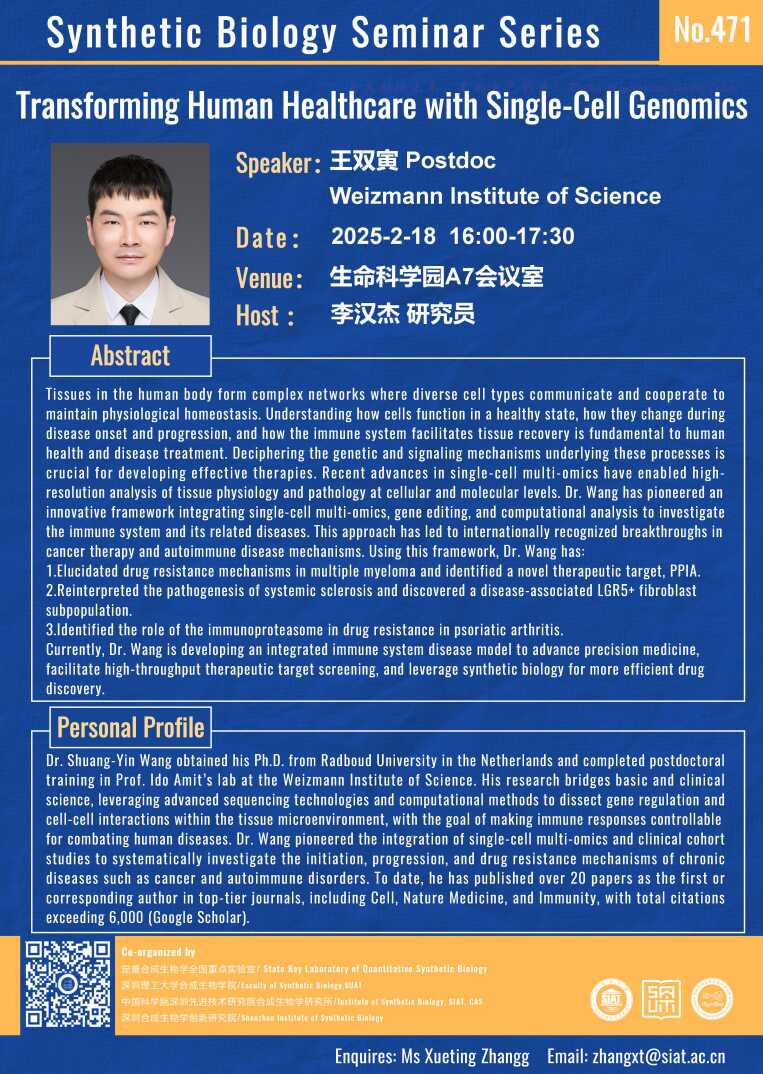 【2025年2月18日 合成所/合成生物学院】Transforming Human Healthcare with Single-Cell Genomics