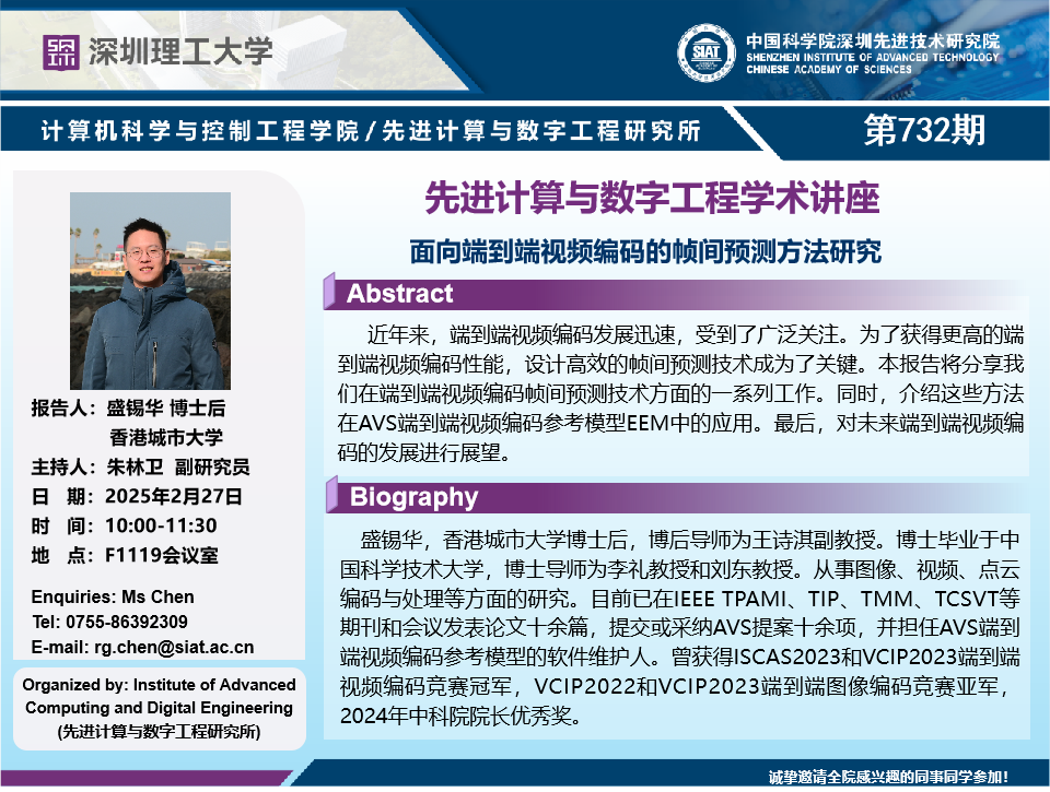 大家好!数字所/计算机学院第732期学术讲座将于2月27日10:00-11:30在F1119会议室举行,本次讲座将邀请香港城市大学 盛锡华 博士后作题为“面向端到端视频编码的帧间预测方法研究”的报告。本次报告将由数字所 朱林卫 副研究员主持,诚挚邀请大家参加、学习和交流!