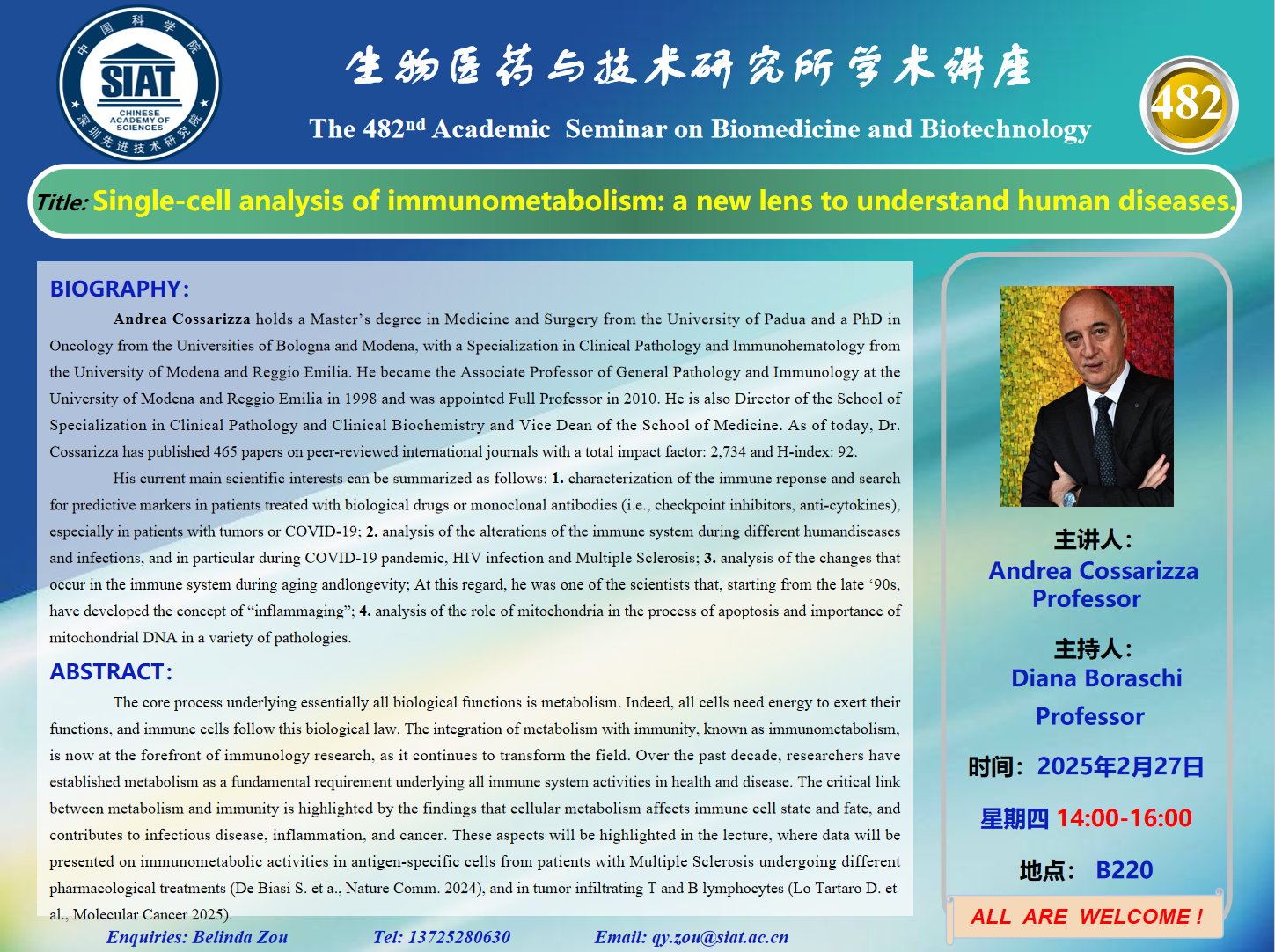 大家好! 医药所第482期学术讲座将于2025年2月27日 星期四 14:00-16:00 B220会议室举行。本次讲座邀请了来自摩德纳-雷焦·艾米利亚大学 Andrea Cossarizza 教授带来“Single-cell analysis of immunometabolism: a new lens to understand human diseases”的报告。届时,Diana Boraschi 研究员将主持讲座。