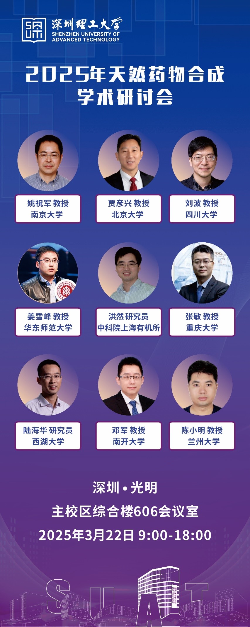 大家好!为积极推动深圳理工大学药学院的科教融合和加强国内药物合成领域专家的交流沟通,深圳理工大学药学院将于2025年3月22日(周六)9:00在深圳理工大学光明主校区综合楼606会议室举办“2025年天然药物合成学术研讨会”。本次研讨会邀请了国内天然药物合成领域的顶尖学者分享天然药物合成领域的最新研究成果、技术创新和发展趋势;共同探讨药物合成的最新进展、挑战与未来发展方向;搭建一个跨地区的学术交流平台,促进不同科研机构和科研团队之间的思想碰撞,激发新的研究思路和方法,推动医药科学的整体发展。