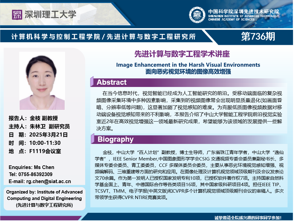 大家好!数字所/计算机学院第736期学术讲座将于3月21日10:00-11:30在F1119会议室举行,本次讲座将邀请中山大学 金枝 副教授作题为“ 面向恶劣视觉环境的图像高效增强(Image Enhancement in the Harsh Visual Environments)”的报告。本次报告将由数字所 朱林卫 副研究员主持,诚挚邀请大家参加、学习和交流!