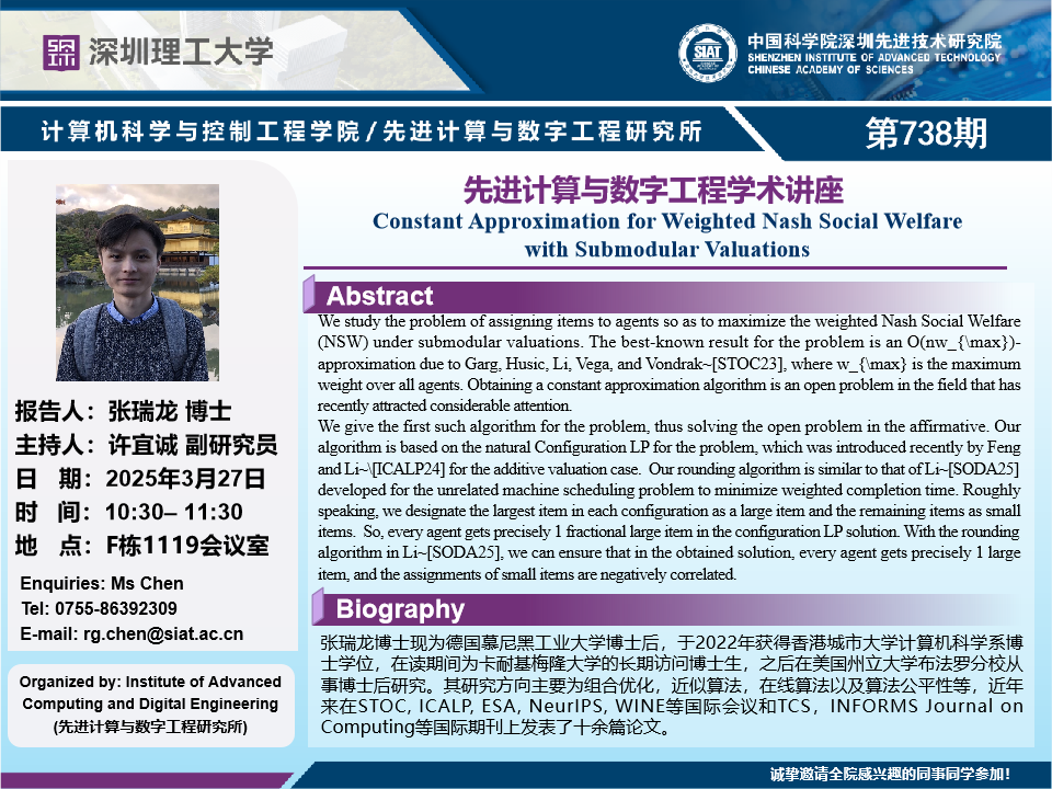 大家好!数字所/计算机学院第738期学术讲座将于3月27日10:30-11:30在F1119会议室举行,本次讲座将邀请德国慕尼黑工业大学 张瑞龙 博士作题为“Constant Approximation for Weighted Nash Social Welfare with Submodular Valuations”的报告。