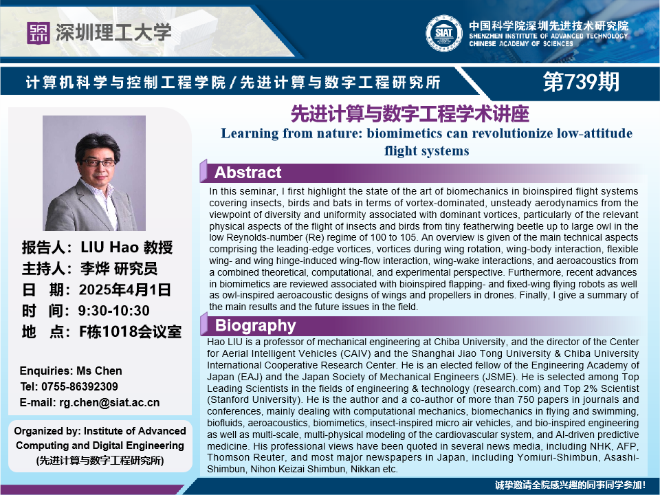 数字所/计算机学院第739期学术讲座将于4月1日9:30-10:30在F1018会议室举行,本次讲座将邀请日本千叶大学 LIU Hao 教授作题为“Learning from nature: biomimetics can revolutionize low-attitude flight systems ”的报告。