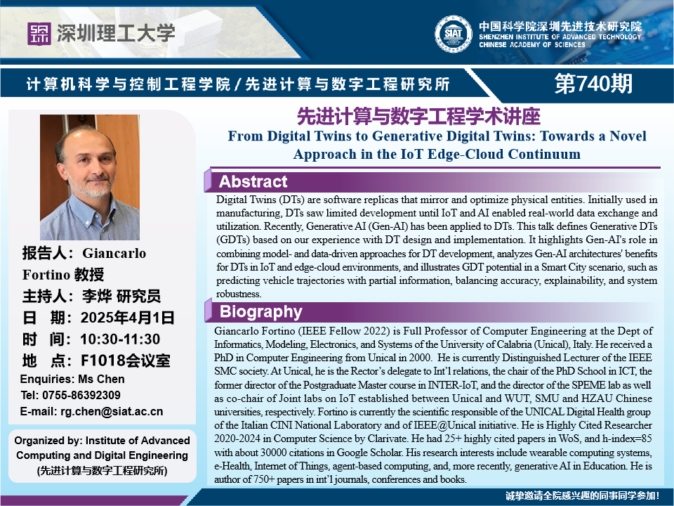 数字所/计算机学院第740期学术讲座将于4月1日10:30-11:30在F1018会议室举行,本次讲座将邀请意大利卡拉布里亚大学(Unical) Giancarlo Fortino 教授作题为“From Digital Twins to Generative Digital Twins: Towards a Novel Approach in the IoT Edge-Cloud Continuum”的报告。本次报告将由数字所 李烨 研究员主持,诚挚邀请大家参加、学习和交流!