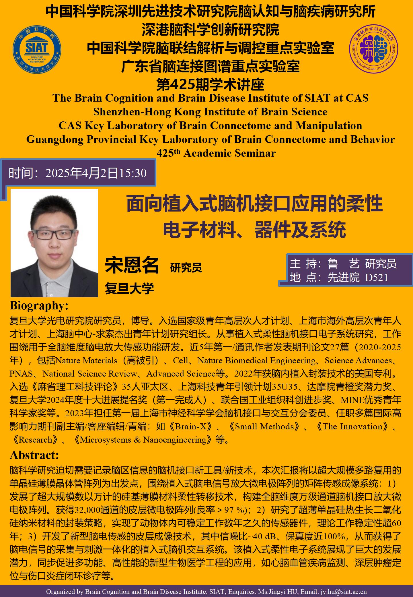 大家好!脑所/深港脑院将于4月2日(星期三) 15:30,地点:先进院D521会议室 举办第425期学术讲座。本次讲座邀请到复旦大学 宋恩名 研究员,带来题为“面向植入式脑机接口应用的柔性电子材料、器件及系统”的报告。届时,鲁艺研究员将主持讲座。