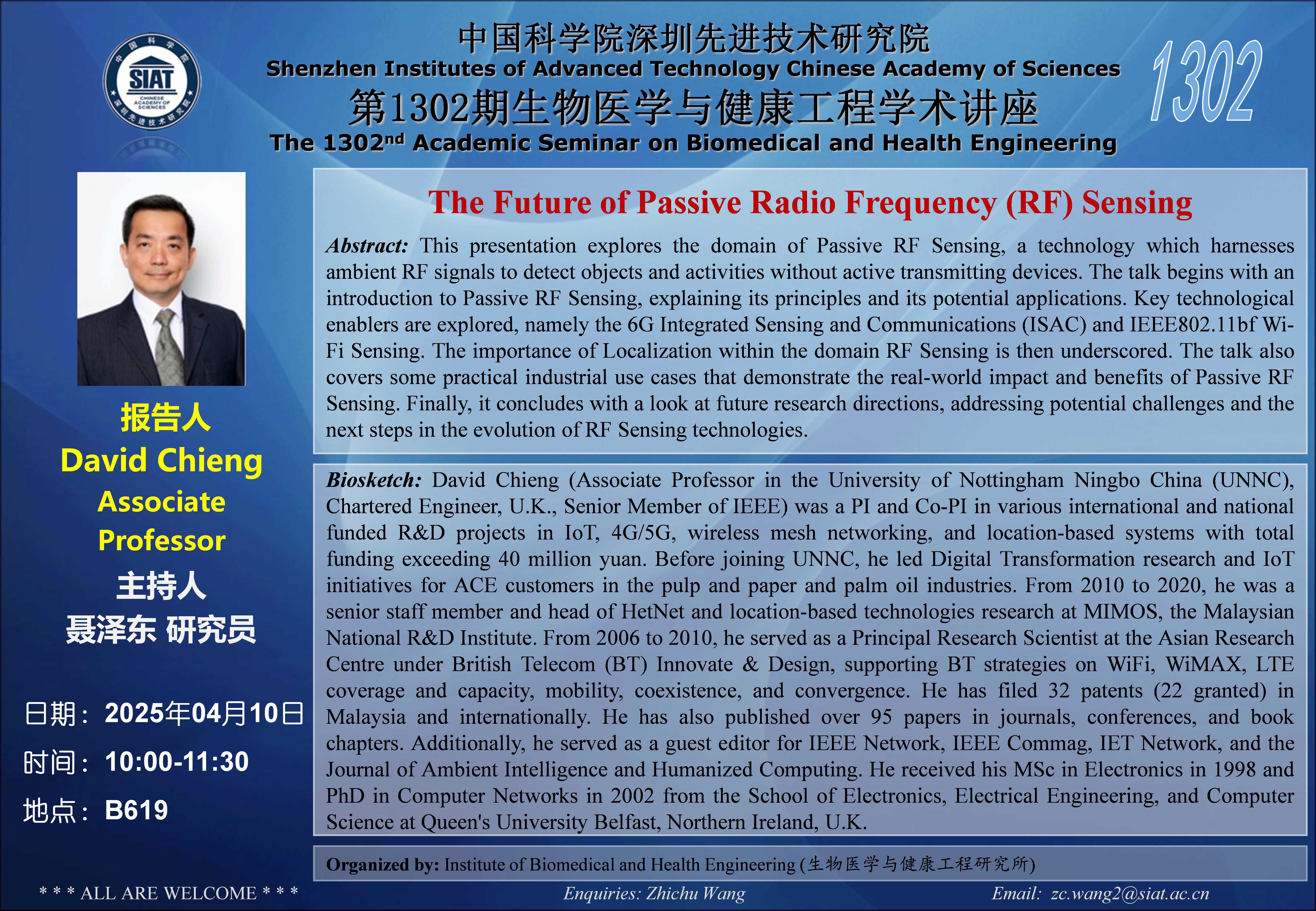 本次讲座邀请了宁波诺丁汉大学 David Chieng带来题为“The Future of Passive Radio Frequency (RF) Sensing”的报告。