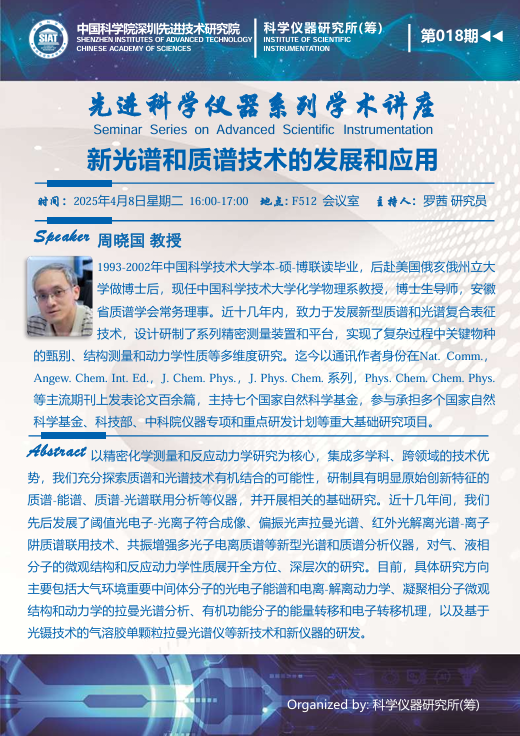 科学仪器研究所(筹)第018期 先进科学仪器系列学术讲座将于2025年4月8日(星期二)下午16:00-17:00举行,讲座地点:F512会议室。