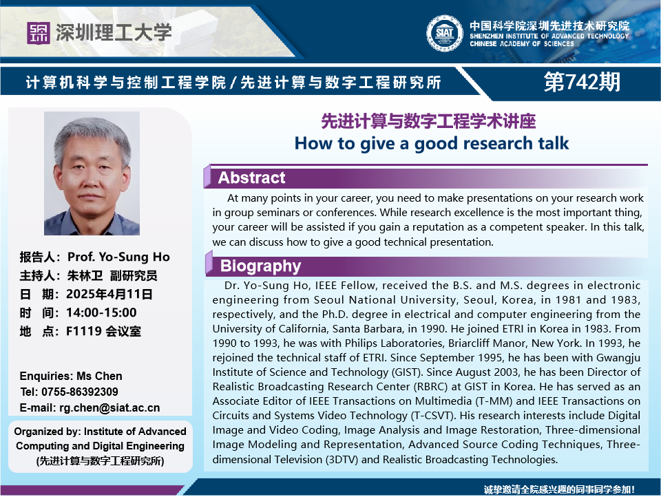 大家好!数字所/计算机学院第742期学术讲座将于4月11日14:00-15:00在F1119会议室举行,本次讲座将邀请韩国光州科技学院 Yo-Sung Ho 教授作题为“How to give a good research talk”的报告。