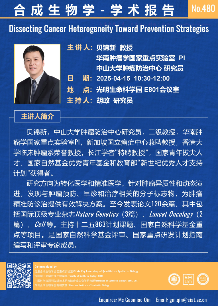 【2025年4月15日 合成所/合成生物学院】Dissecting Cancer Heterogeneity Toward Prevention Strategies