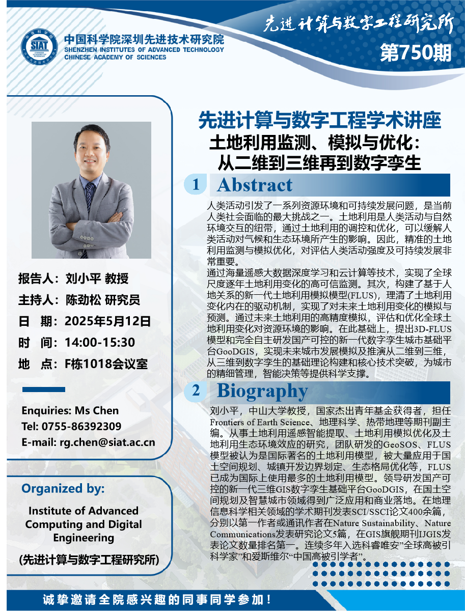 数字所/计算机学院第750期学术讲座将于5月12日14:00-15:30在F1018会议室举行,本次讲座将邀请中山大学 刘小平 教授作题为“土地利用监测、模拟与优化:从二维到三维再到数字孪生”的报告。本次报告将由数字所 陈劲松 研究员主持,诚挚邀请大家参加、学习和交流!