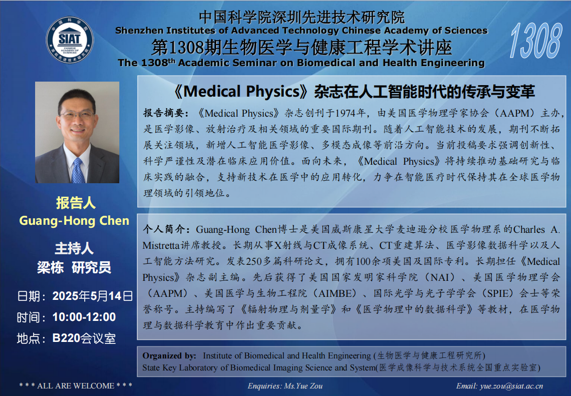 医工所第1308期学术讲座将于 2025年5月14日(周三) 10:00-12:00 在B220会议室举行。