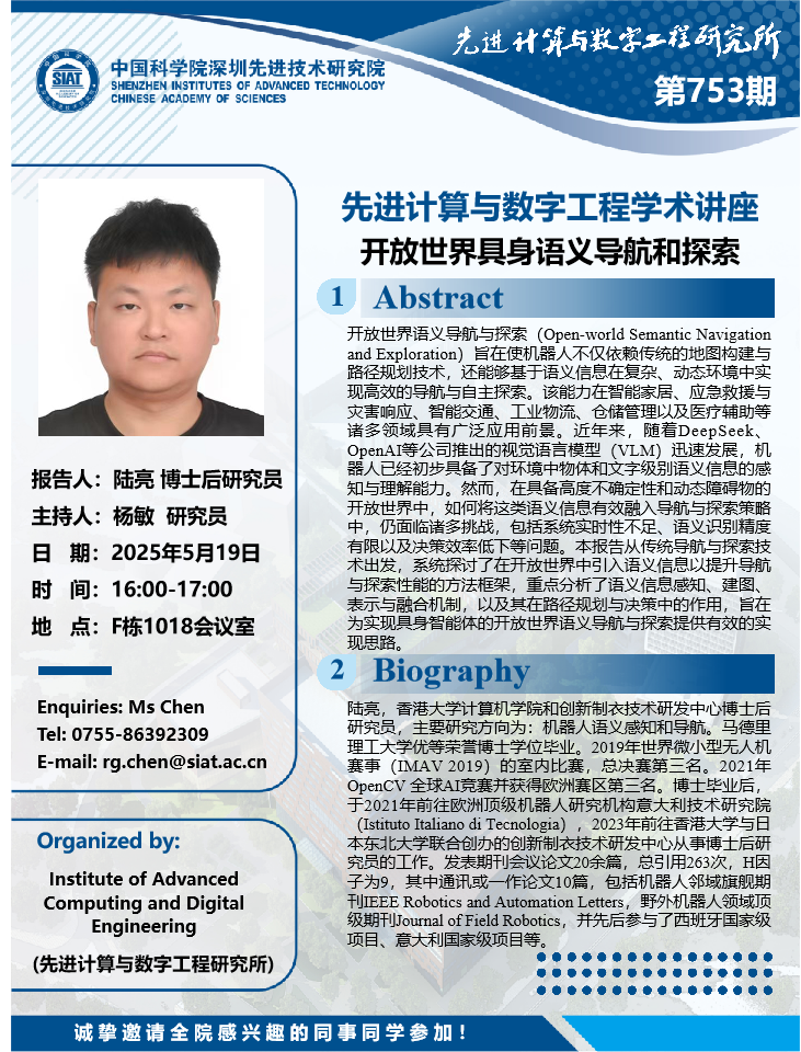 大家好!数字所/计算机学院第753期学术讲座将于5月19日16:00-17:00在F1018会议室举行,本次讲座将邀请香港大学 陆亮 博士后研究员作题为“开放世界具身语义导航和探索”的报告。
