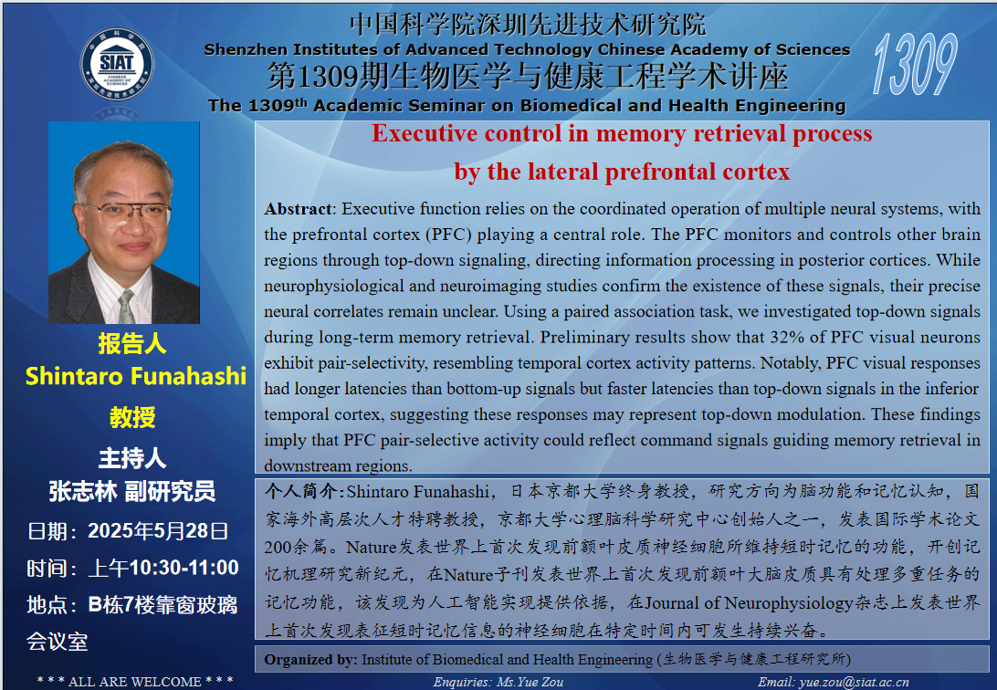 本次讲座邀请了日本京都大学的终身教授 Shintaro Funahashi教授带来题为“Executive control in memory retrieval process by the lateral prefrontal cortex”的报告。