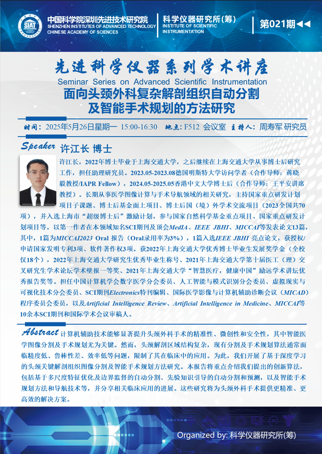 本次讲座邀请上海交通大学 许江长 博士作题为《面向头颈外科复杂解剖组织自动分割及智能手术规划的方法研究》的学术报告。
