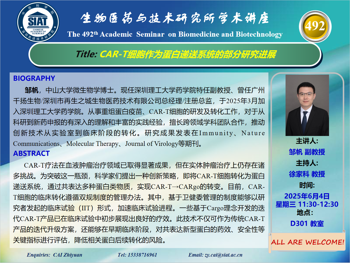 大家好! 医药所第492期学术讲座将于2025年6月4日 星期三 11:30-12:30 D301会议室举行。本次讲座邀请了来自中山大学 邹帆 副教授带来“CAR-T细胞作为蛋白递送系统的部分研究进展”的报告。届时,徐家科 教授将主持讲座。