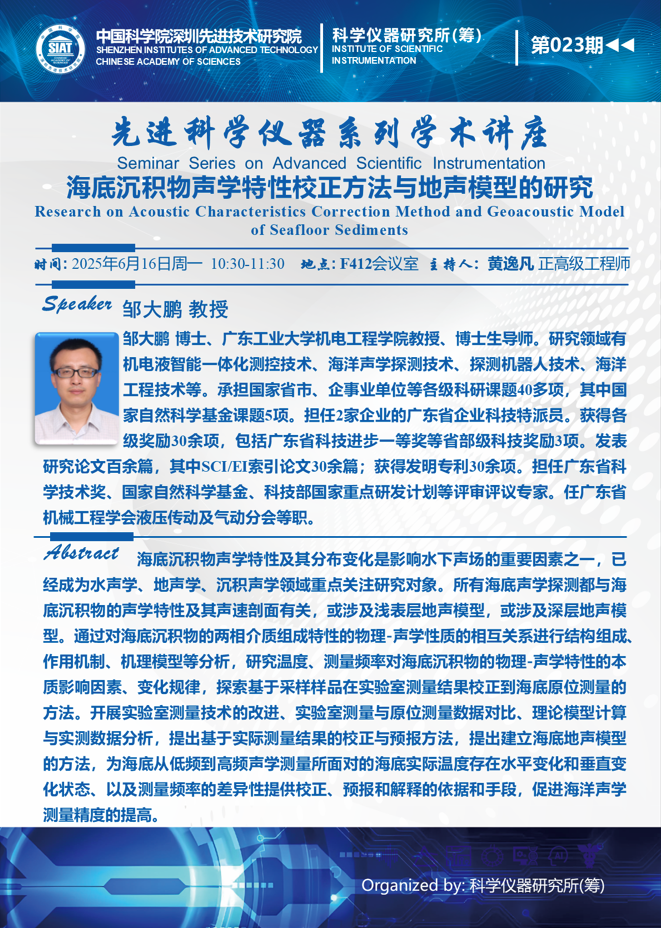 本次讲座邀请广东工业大学 邹大鹏 教授作题为《海底沉积物声学特性校正方法与地声模型的研究》的学术报告。