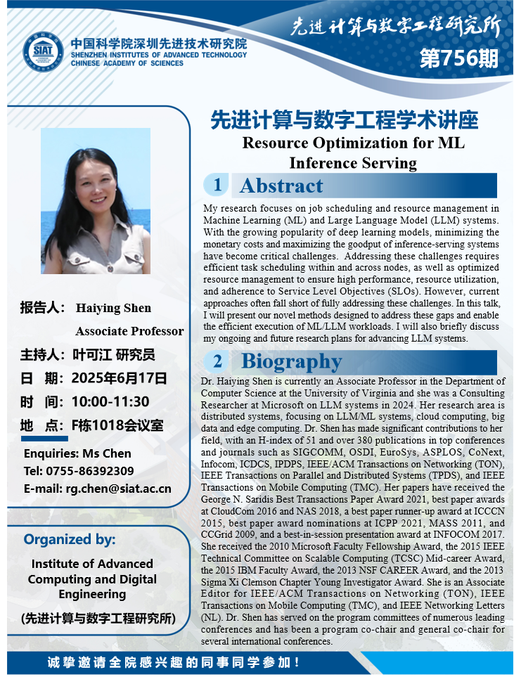 大家好!数字所/计算机学院第756期学术讲座将于6月17日10:00-11:30在F1018会议室举行,本次讲座将邀请弗吉尼亚大学(University of Virginia)Haiying Shen 副教授作题为“Resource Optimization for ML Inference Serving”的报告。
