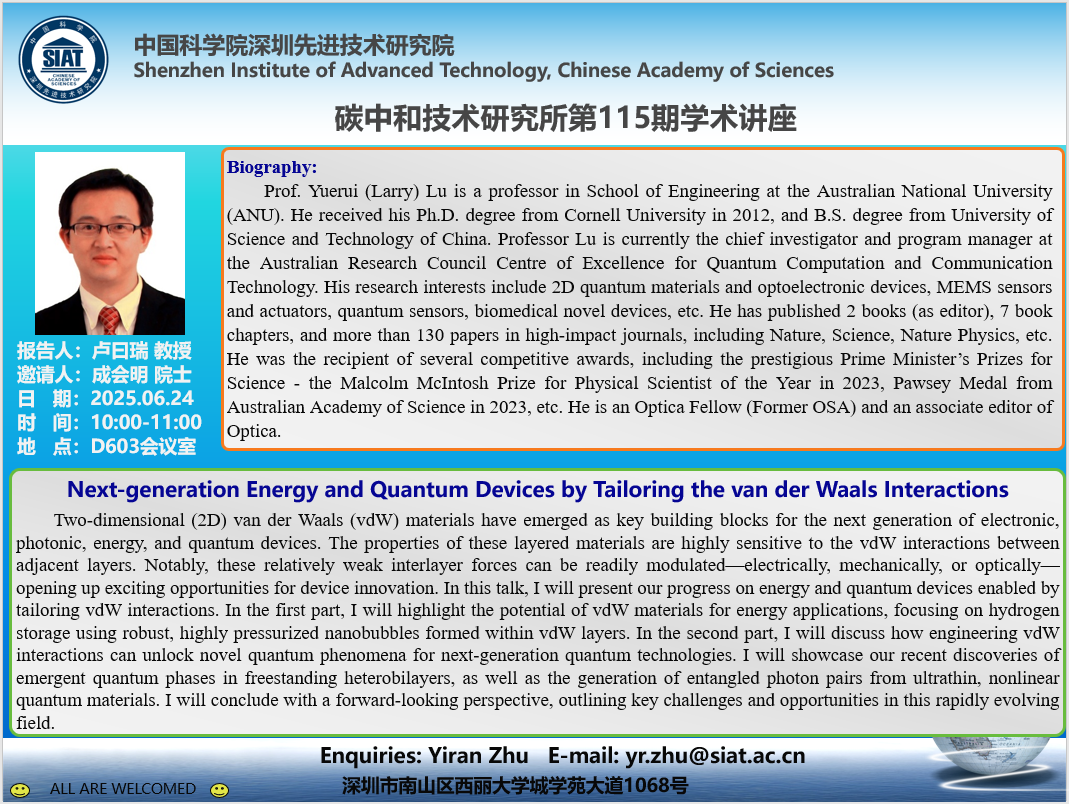 碳中和技术研究所第115期学术讲座将于6月24日(周二)10:00-11:00在D603会议室召开。本次讲座特邀澳大利亚国立大学的卢曰瑞 教授作题为《Next-generation Energy and Quantum Devices by Tailoring the van der Waals Interactions》的学术报告。