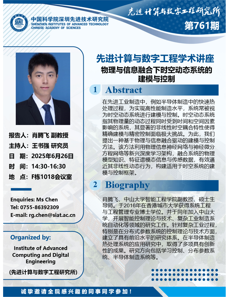 数字所/计算机学院第761期学术讲座将于6月26日14:30-16:30在F1018会议室举行,本次讲座将邀请中山大学 肖腾飞 副教授作题为“物理与信息融合下时空动态系统的建模与控制”的报告。