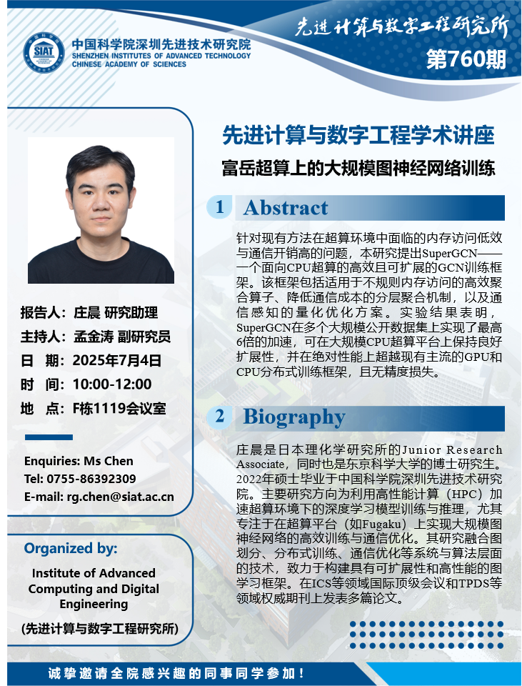 数字所/计算机学院第760期学术讲座将于7月4日10:00-12:00在F1119会议室举行,本次讲座将邀请日本理化学研究所 庄晨 研究助理作题为“富岳超算上的大规模图神经网络训练”的报告。