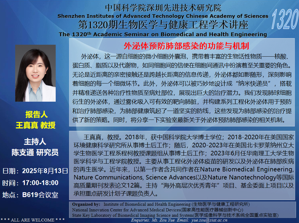 本次讲座邀请了王真真 教授带来题为“外泌体预防肺部感染的功能与机制”的报告。