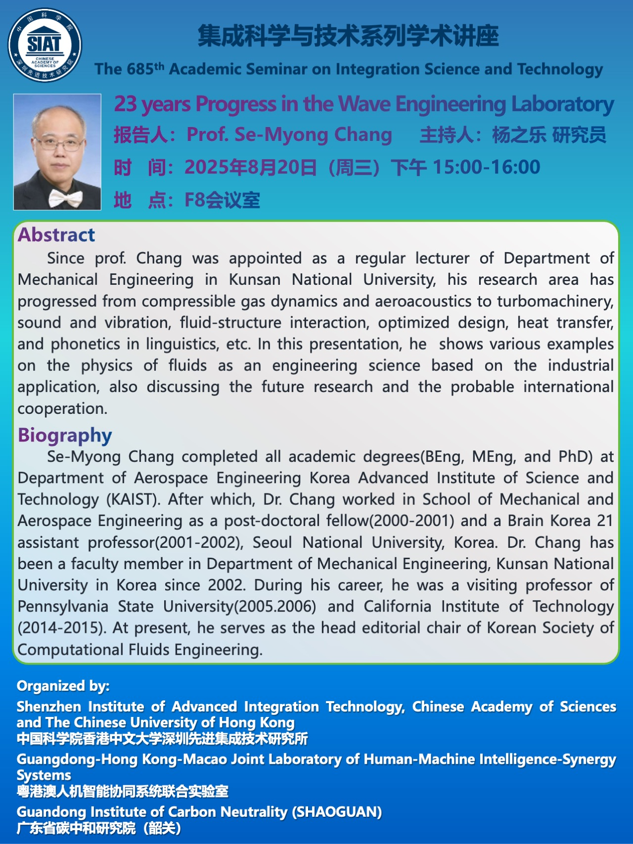 集成所第685期集成科学与技术系列学术讲座将于2025年8月20日(周三)下午 15:00-16:00在F8会议室召开,本次讲座特邀Kunsan National University的Se-Myong Chang教授作题为 23 years Progress in the Wave Engineering Laboratory 的学术报告。