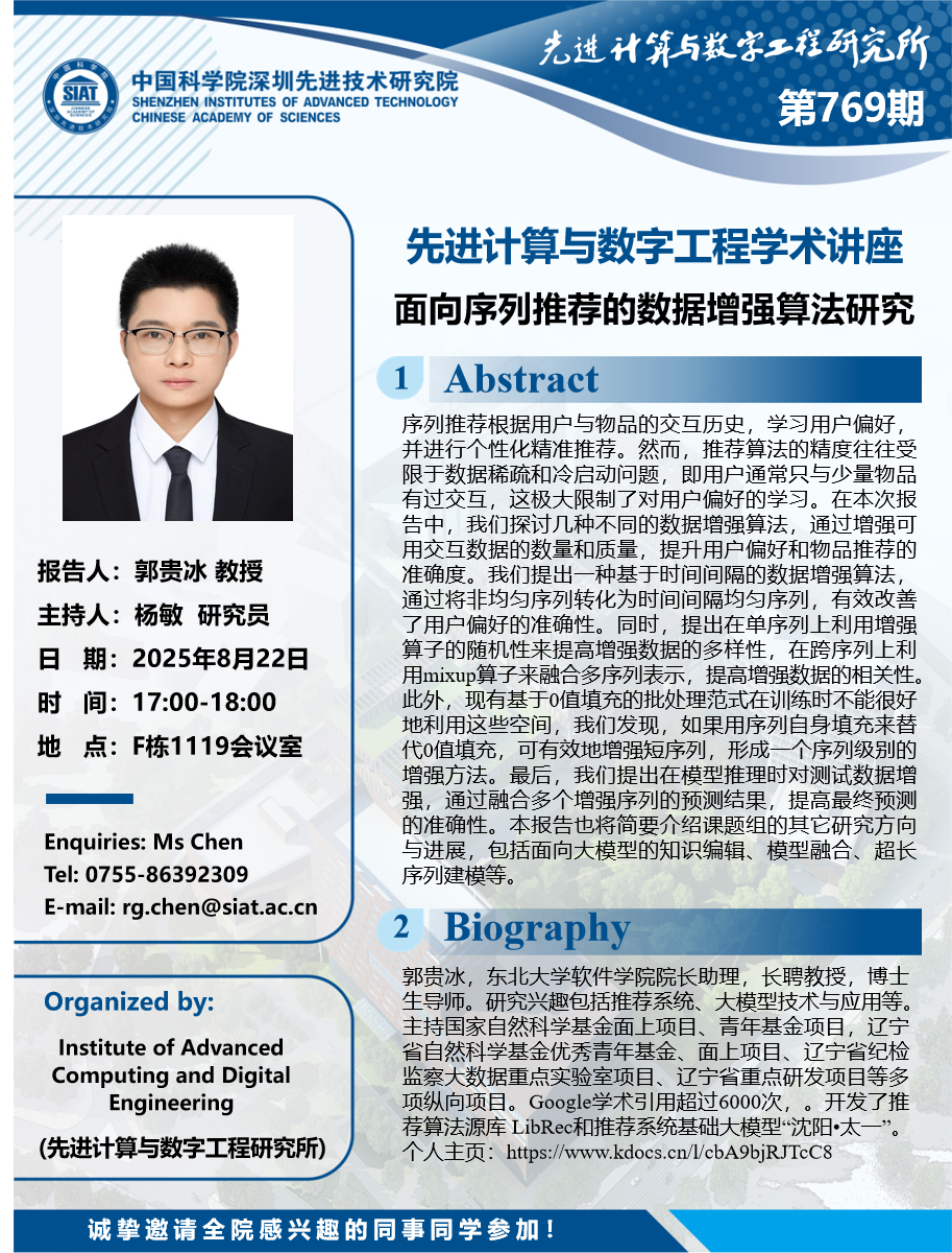 大家好!数字所/计算机学院第769期学术讲座将于8月22日17:00-18:00在F1119会议室举行,本次讲座将邀请东北大学 郭贵冰 教授作题为“面向序列推荐的数据增强算法研究”的报告。