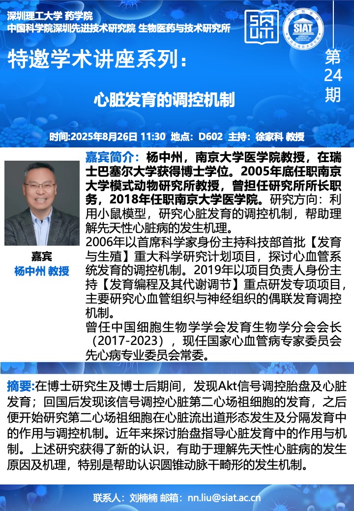 大家好!药学院/医药所“特邀学术讲座系列”第24期将于2025年08月26日(周二)11:30,在先进院D602会议室举行。本次讲座邀请了来自南京大学医学院的杨中州 教授带来题为“心脏发育的调控机制”的报告。届时,徐家科 教授将主持讲座。