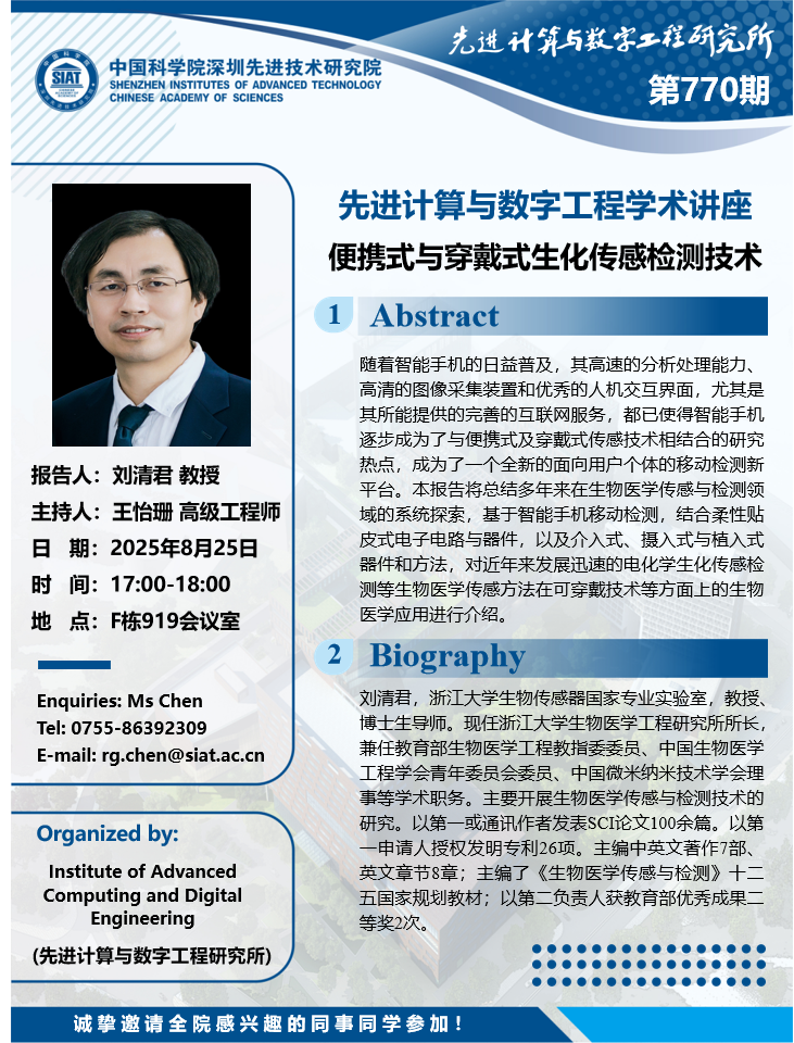 大家好!数字所/计算机学院第770期学术讲座将于8月25日17:00-18:00在F919会议室举行,本次讲座将邀请浙江大学 刘清君 教授作题为“便携式与穿戴式生化传感检测技术”的报告。