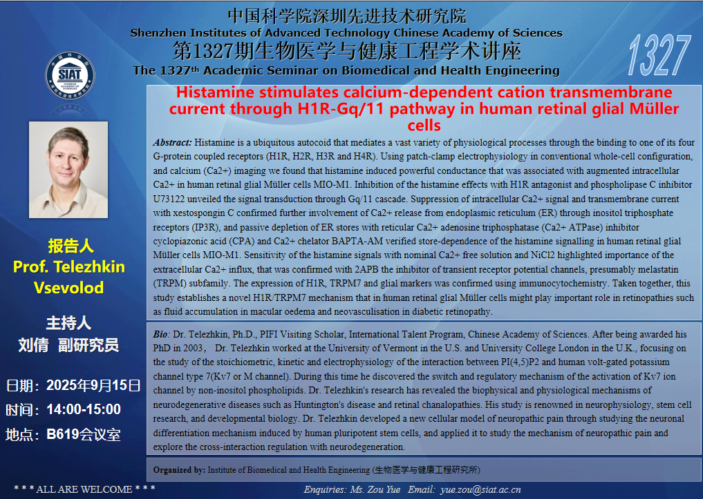 本次讲座邀请了Prof. Telezhkin Vsevolod带来题为“Histamine stimulates calcium-dependent cation transmembrane current through H1R-Gq/11 pathway in human retinal glial Müller cells”的报告。