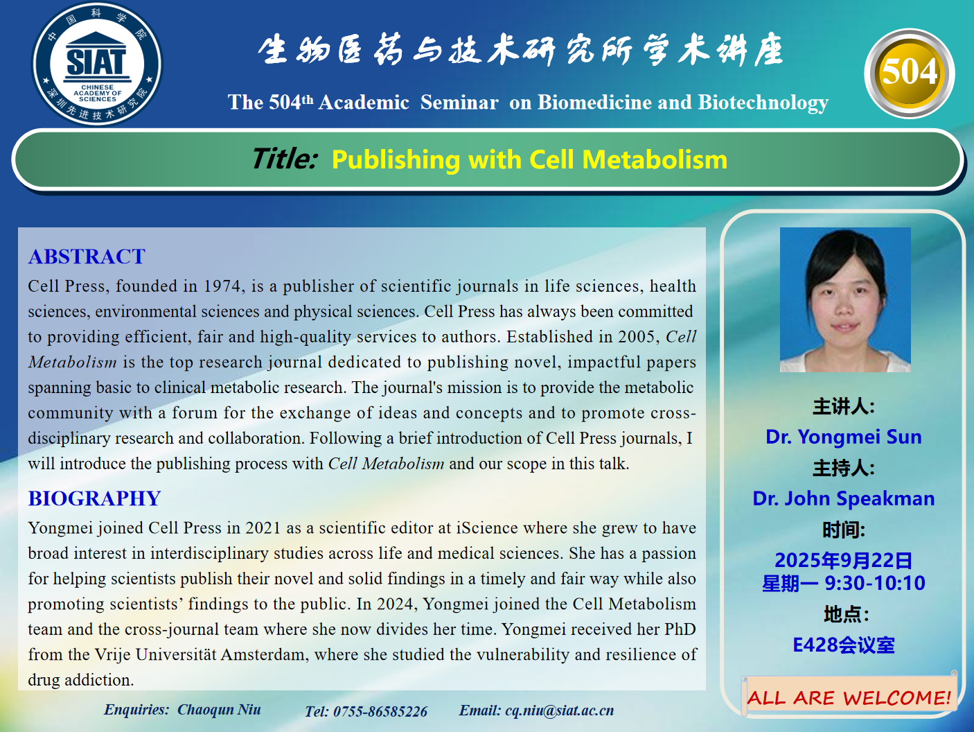 大家好! 医药所第504期学术讲座将于2025年9月22日 星期一 9:30-10:10 E428会议室举行。本次讲座邀请了来自Cell Metabolism期刊科学编辑 孙永梅 博士 带来“ Publishing with Cell Metabolism”的报告。届时,John Speakman 院士将主持讲座。