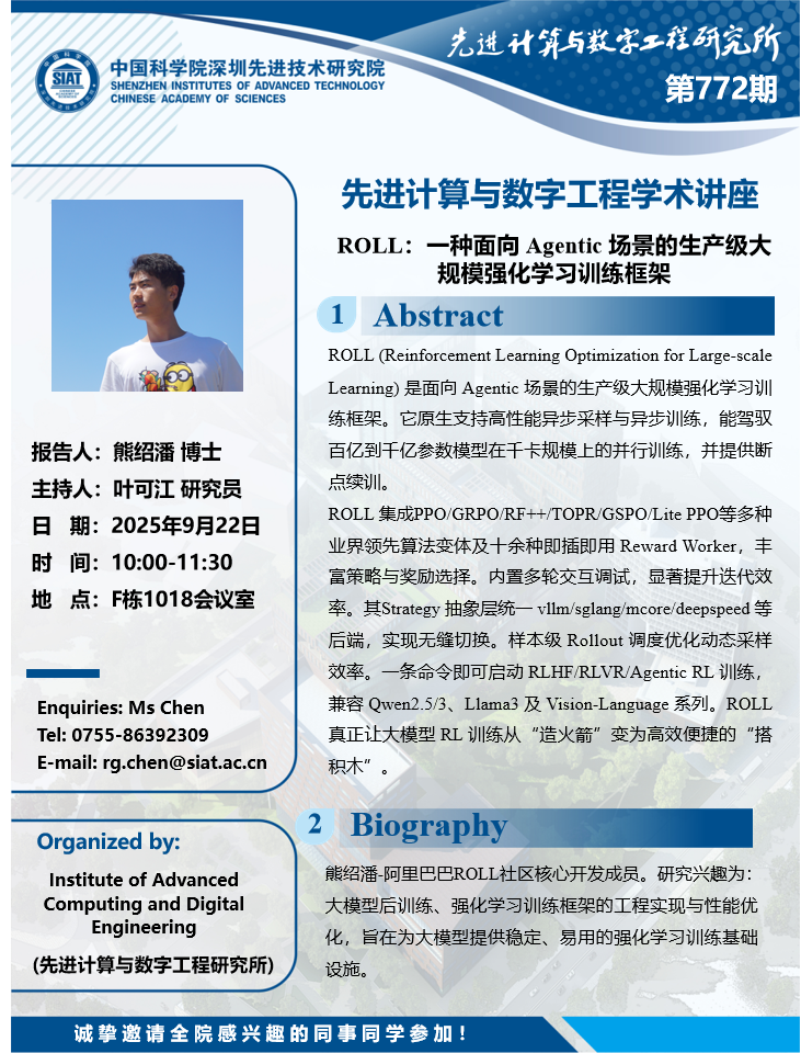 大家好!数字所/计算机学院772学术讲座将于9月22日10:00-11:30在F1018会议室举行,本次讲座将邀请阿里巴巴公司 熊绍潘 博士作题为“ROLL:一种面向 Agentic 场景的生产级大规模强化学习训练框架的报告。