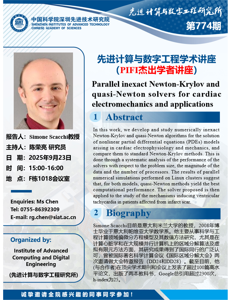 数字所/计算机学院第774期学术讲座时间改到9月22日15:30-16:30在F1018会议室举行,本次讲座将邀请意大利米兰大学 Simone Scacchi 教授作题为“Parallel inexact Newton-Krylov and quasi-Newton solvers for cardiac electromechanics and applications”的报告。