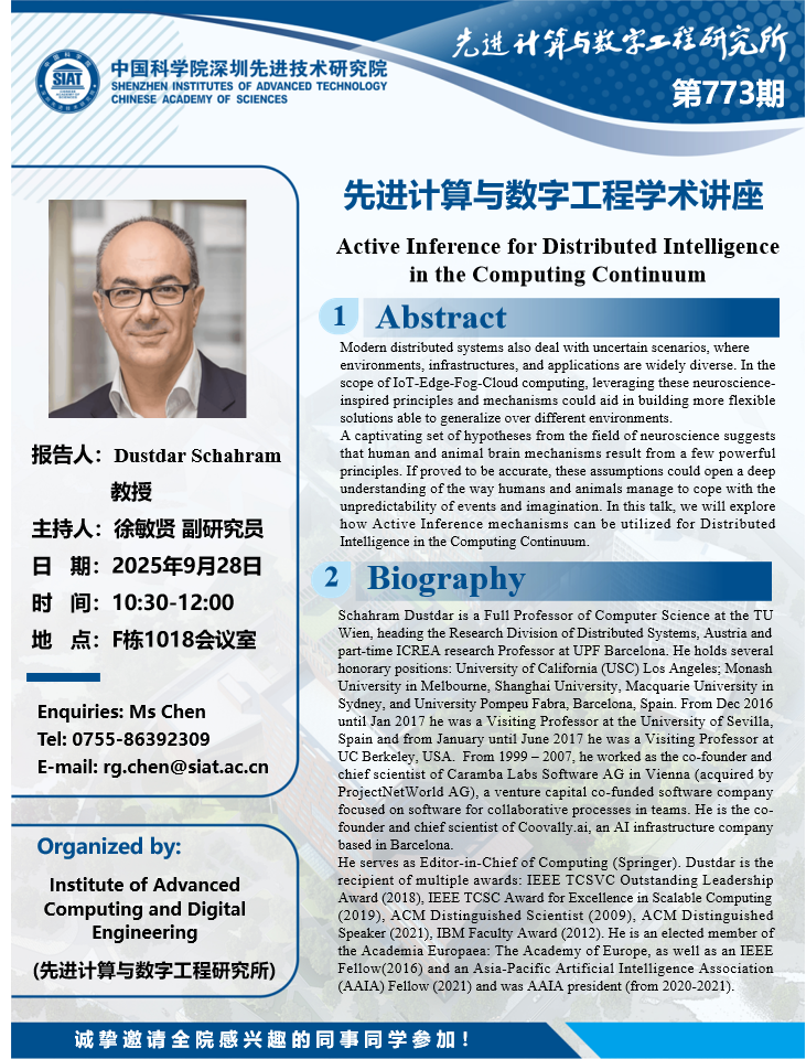 大家好!数字所/计算机学院第773期学术讲座将于9月28日10:30-12:00在F1018会议室举行,本次讲座将邀请Technische Universität Wien(维也纳工业大学) Dustdar Schahram 教授作题为“Active Inference for Distributed Intelligence in the Computing Continuum”的报告。
