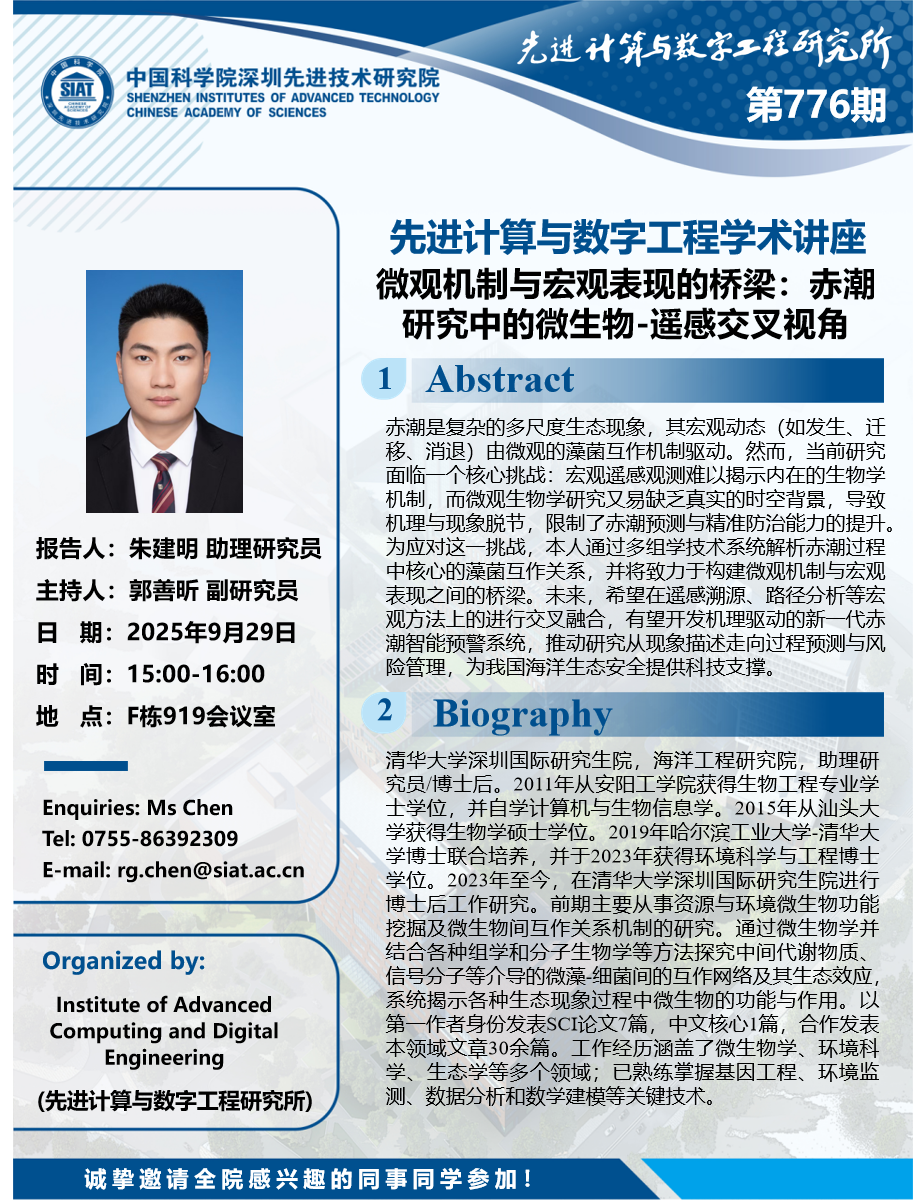 大家好!数字所/计算机学院第776期学术讲座将于9月29日15:00-16:00在F919会议室举行,本次讲座将邀请清华大学深圳国际研究生院 朱建明 助理研究员作题为“微观机制与宏观表现的桥梁:赤潮研究中的微生物-遥感交叉视角”的报告。