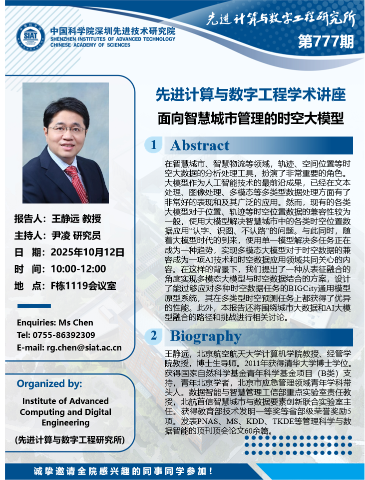 大家好!数字所/计算机学院第777期学术讲座将于10月12日10:00-12:00在F1119会议室举行,本次讲座将邀请北京航空航天大学 王静远 教授作题为“面向智慧城市管理的时空大模型”的报告。