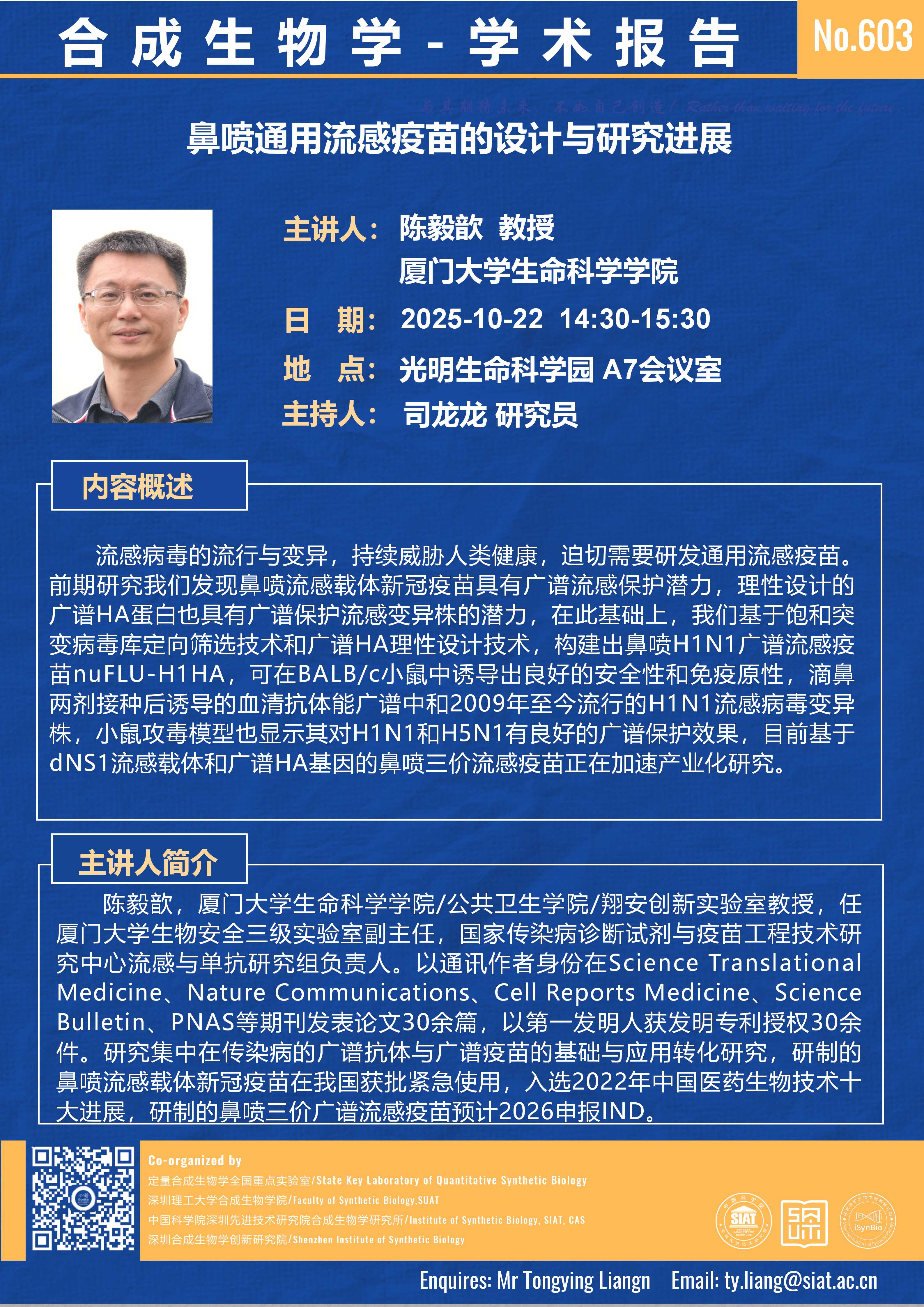 合成所/合成生物学院第603期学术讲座将于 10月22日(星期三)14:30-15:30 在 光明生命科学园 A7会议室 举行。