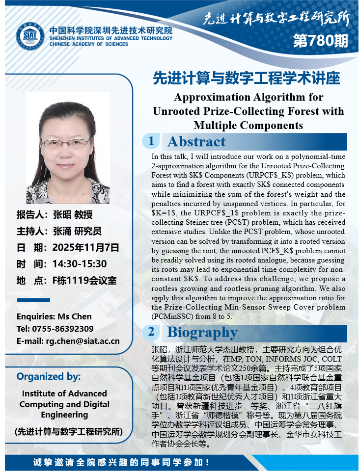 邀请浙江师范大学 张昭 教授作题为“Approximation Algorithm for Unrooted Prize-Collecting Forest with
