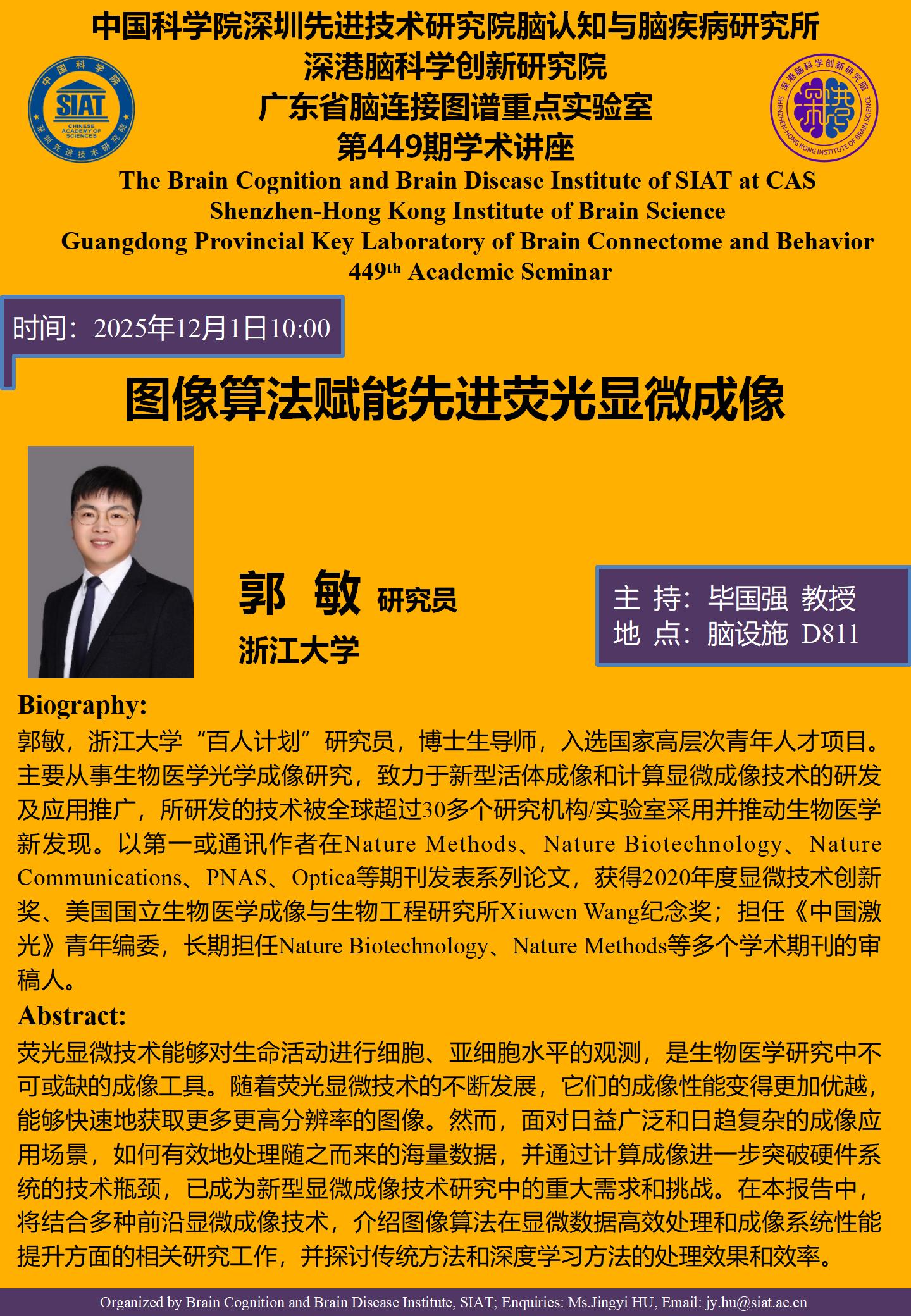 大家好!脑所/深港脑院将于12月1日(星期一) 10:00,地点:脑设施D811 会议室 举办第449期学术讲座。本次讲座邀请到浙江大学 郭敏 研究员,带来题为“图像算法赋能先进荧光显微成像 ”的报告。腾讯会议:313-554-246