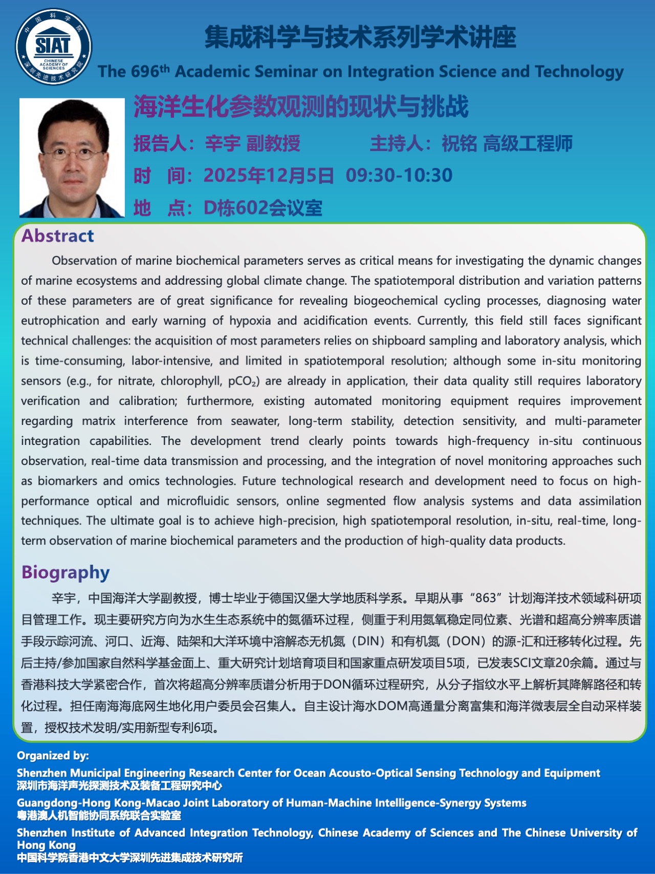 集成所第696期集成科学与技术系列学术讲座将于 2025年12月5日(周五)上午 09:30-10:30 在 D栋602会议室 召开。本次讲座特邀 中国海洋大学 的 辛宇 副教授 作题为《海洋生化参数观测的现状与挑战》的学术报告。