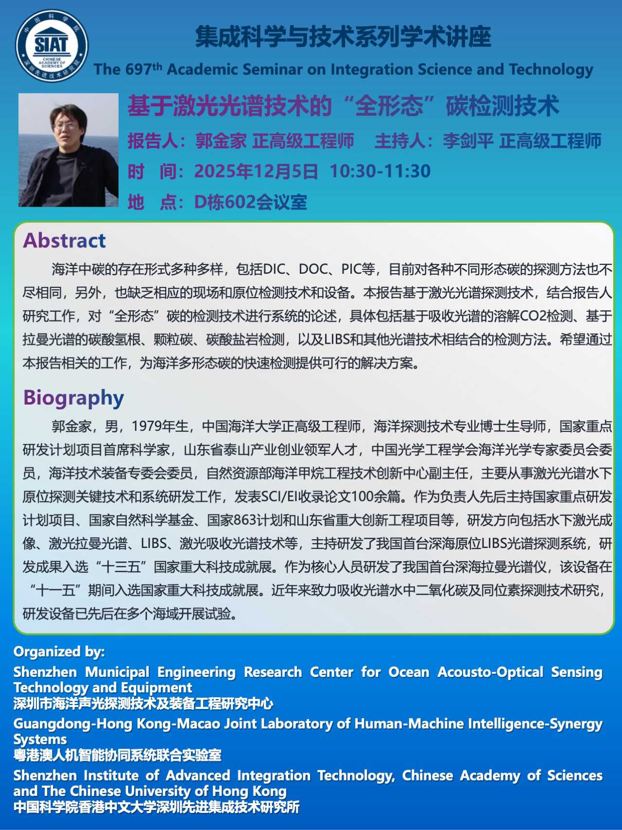 集成所第697期集成科学与技术系列学术讲座将于 2025年12月5日(周五)上午10:30-11:30 在 D栋602会议室 召开。本次讲座特邀 中国海洋大学 的 郭金家 正高级工程师 作题为《基于激光光谱技术的“全形态”碳检测技术》的学术报告。