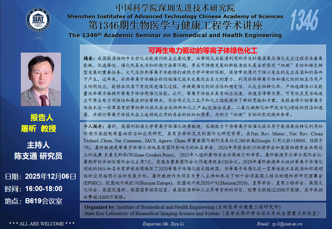 医工所第1346期学术讲座将于 2025年12月6日(周六)16:00-18:00 在B619会议室举行。