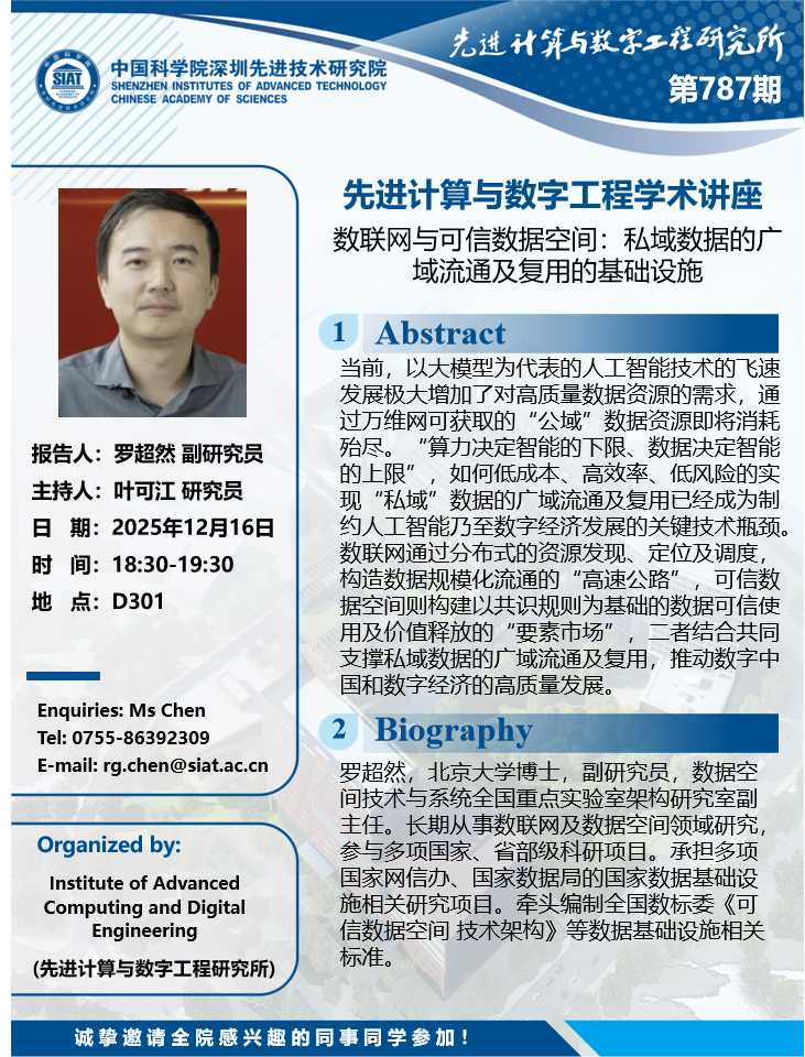 大家好!数字所/计算机学院第787期学术讲座将于12月16日18:30-19:30在D301会议室举行,本次讲座将邀请北京大学 罗超然 副研究员作题为“数联网与可信数据空间:私域数据的广域流通及复用的基础设施”的报告。本次报告将由数字所 叶可江 研究员主持,诚挚邀请大家参加、学习和交流!