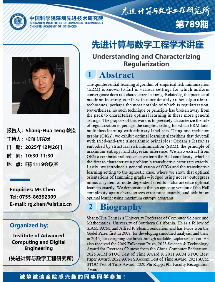 大家好!数字所/计算机学院第789期学术讲座将于12月26日10:30-11:30在F1119会议室举行,本次讲座将邀请 南加利福尼亚大学(University of Southern California, USC) Shang-Hua Teng 教授作题为“Understanding and Characterizing Regularization”的报告。本次报告将由数字所 张涌 研究员主持,诚挚邀请大家参加、学习和交流!