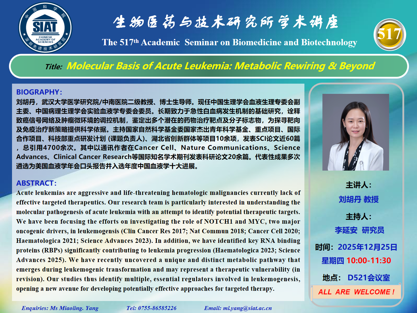 大家好! 医药所第517期学术讲座将于2025年12月25日 星期四 10:00-11:30 D521大会议室举行。本次讲座邀请了来自武汉大学 刘胡丹 教授带来“Molecular Basis of Acute Leukemia: Metabolic Rewiring & Beyond”的报告。届时,李延安 研究员将主持讲座。