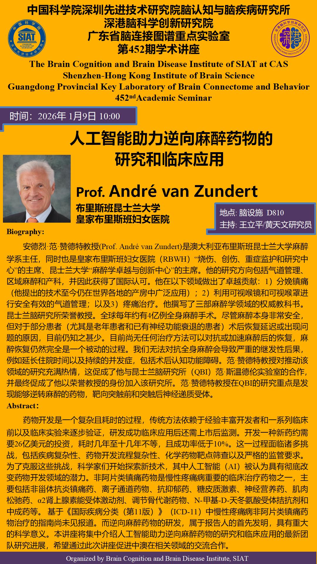 大家好!脑所/深港脑院将于1月9日(星期五) 10:00,地点:脑设施D810 会议室 举办第452期学术讲座。本次讲座邀请到布里斯班昆士兰大学/皇家布里斯班妇女医院的André van Zundert 教授,带来题为“人工智能助力逆向麻醉药物的研究和临床应用 ”的报告。