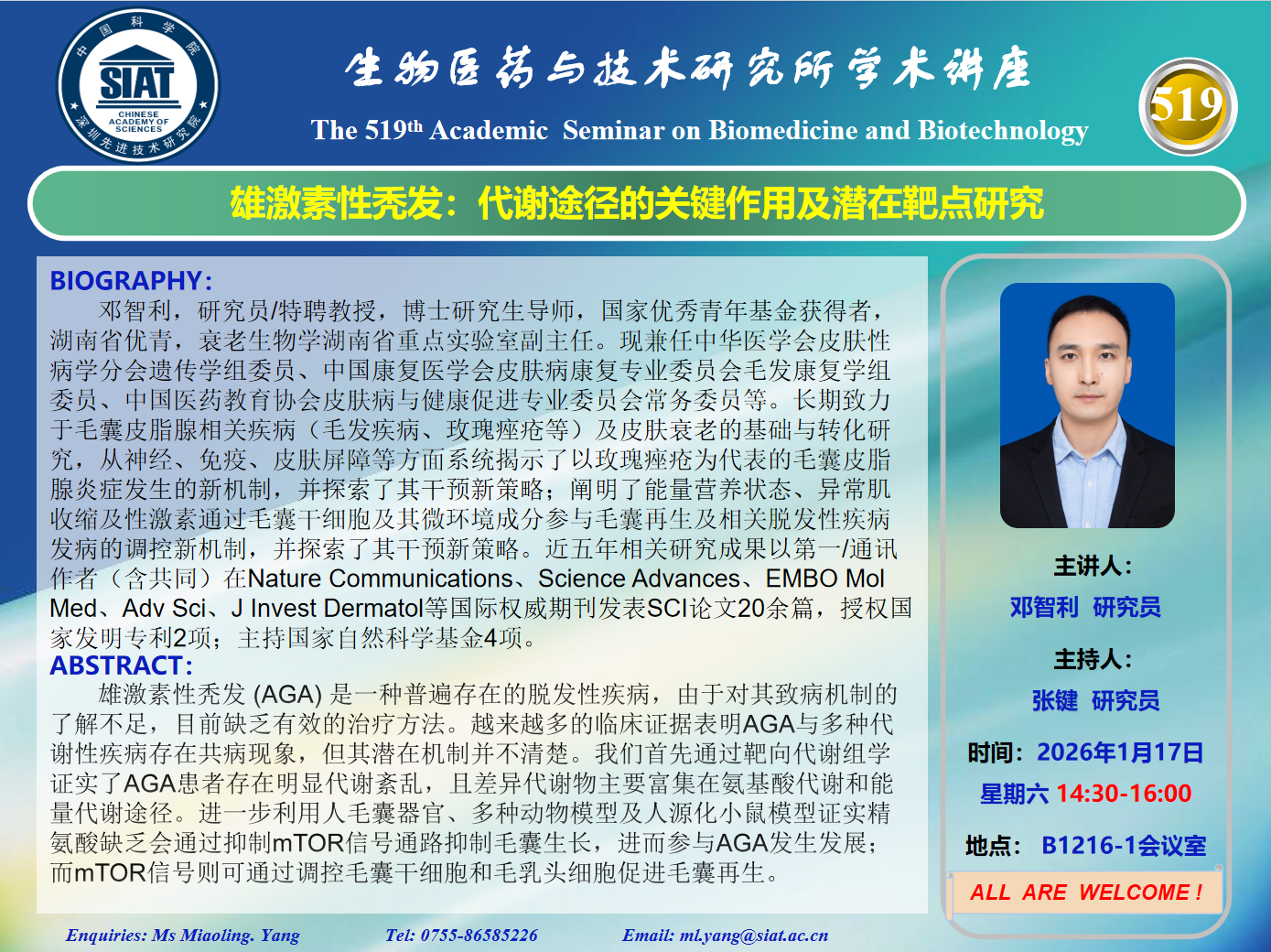 大家好! 医药所第519期学术讲座将于2026年1月17日 星期六 14:30-16:00 B1216-1大会议室举行。本次讲座邀请了来自中南大学湘雅医学院 邓智利 研究员带来“雄激素性秃发:代谢途径的关键作用及潜在靶点研究”的报告。届时,张键 研究员将主持讲座。