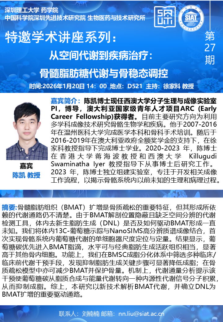 大家好!药学院/医药所“特邀学术讲座系列”第27期将于2026年1月20日(周二)14:00,在先进院D521会议室举行。本期讲座特邀西澳大学的陈凯 教授,带来题为“从空间代谢到疾病治疗:骨髓脂肪糖代谢与骨稳态调控”的报告。届时,徐家科 教授将主持讲座。