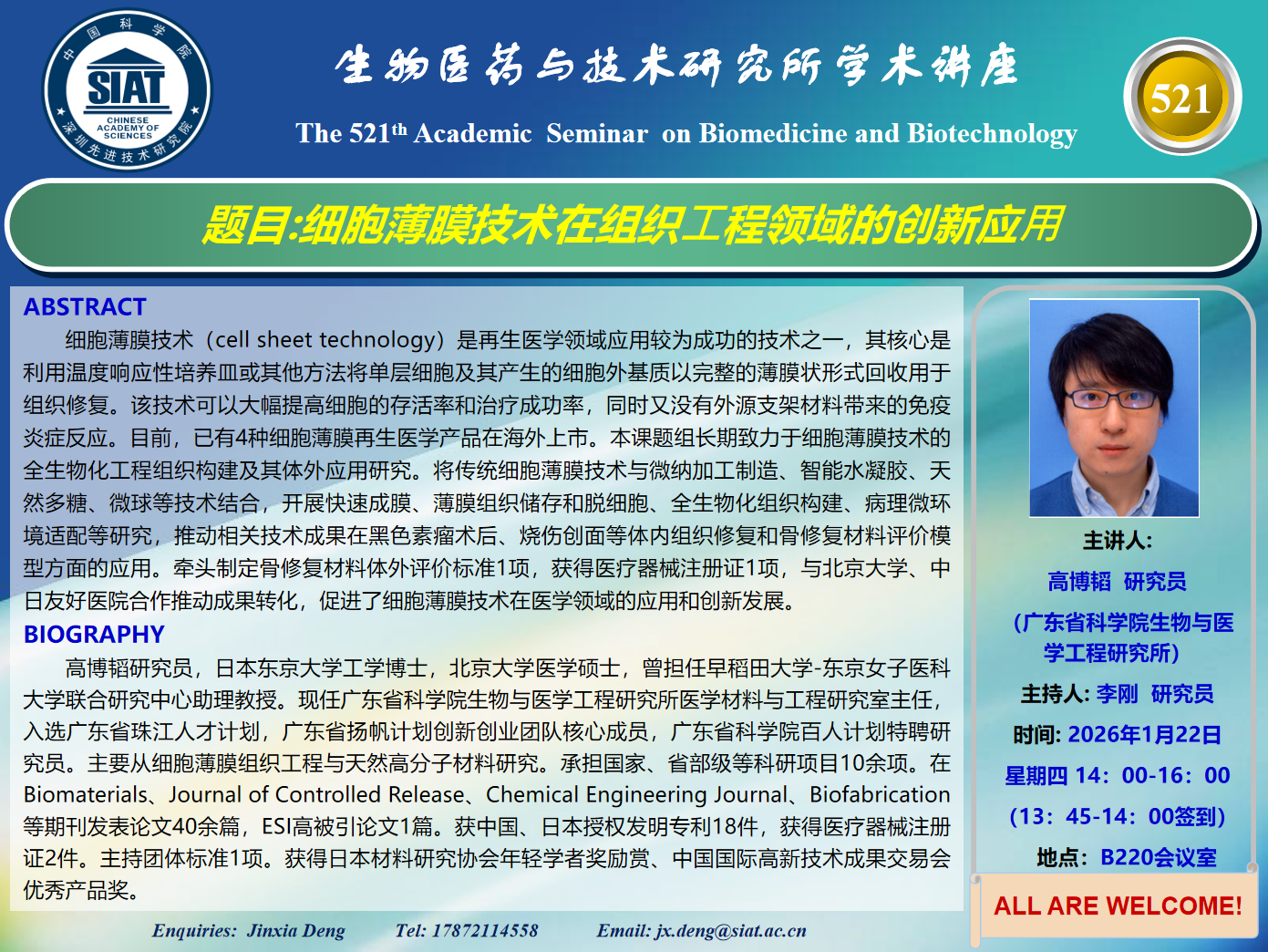 大家好! 医药所第521期学术讲座将于2026年1月22日 星期四 14: 00-16: 00 B220大会议室举行。本次讲座邀请了来自广东省科学院生物与医学工程研究所 高博韬 研究员带来“细胞薄膜技术在组织⼯程领域的创新应⽤”的报告。届时,李刚 研究员将主持讲座。